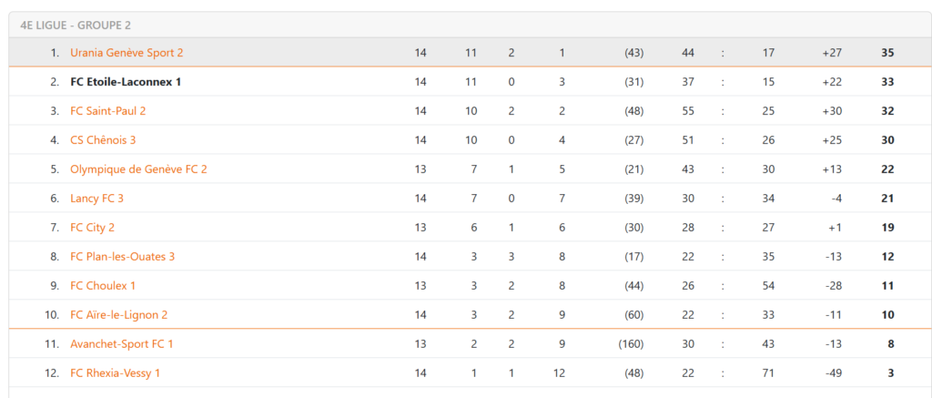 FC Etoile-Laconnex 1 : Graho; Desmeules, Bovay, Ponsot(C), Fernandez, Florez, Armijos, Peguiron, Pellein, Babey, Cugnetto.